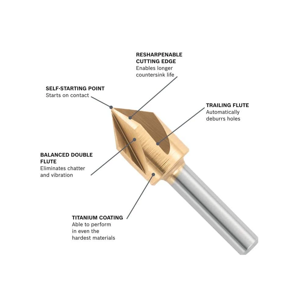 The self-starting point and five-fluted design on the Bosch 1/2 in. Titanium Countersink allow it to make clean, accurate cuts in even the toughest materials. It leaves smooth, burr-free edges on soft metal, steel, iron, wood and plastic with an 82-degree chamfer that creates a snug resting place for countersunk screw heads. Constructed with high-speed steel and coated with super-hard titanium, this bit has the durability to withstand high-heat conditions for lasting use.