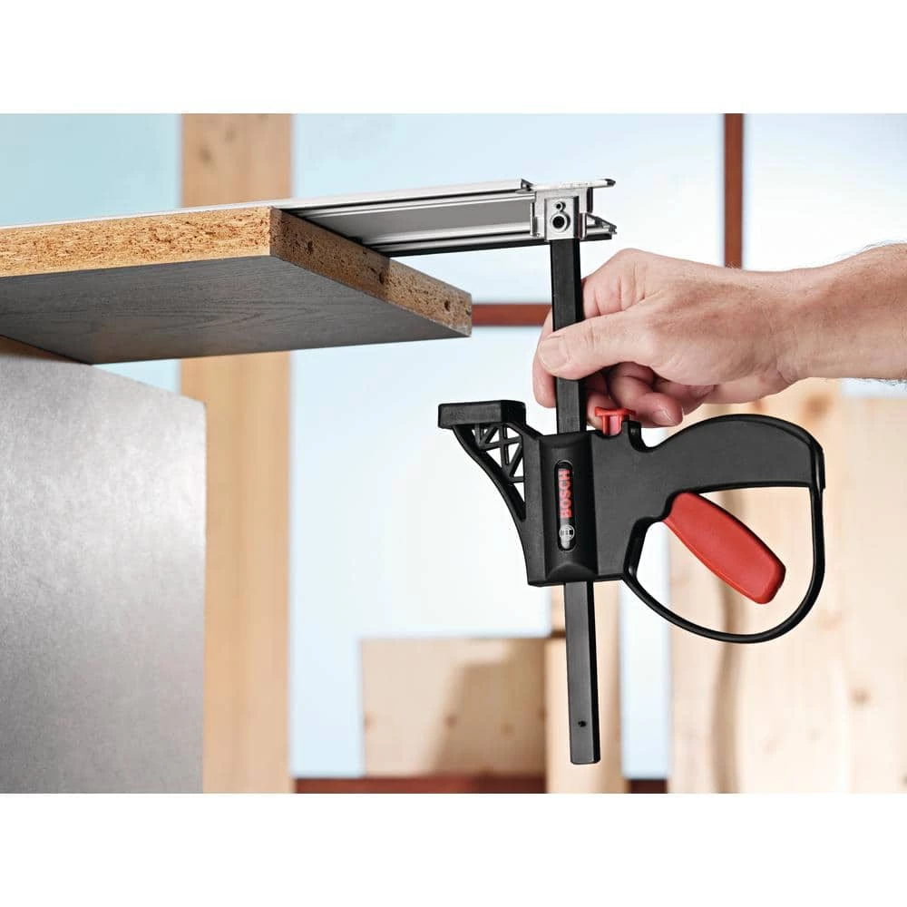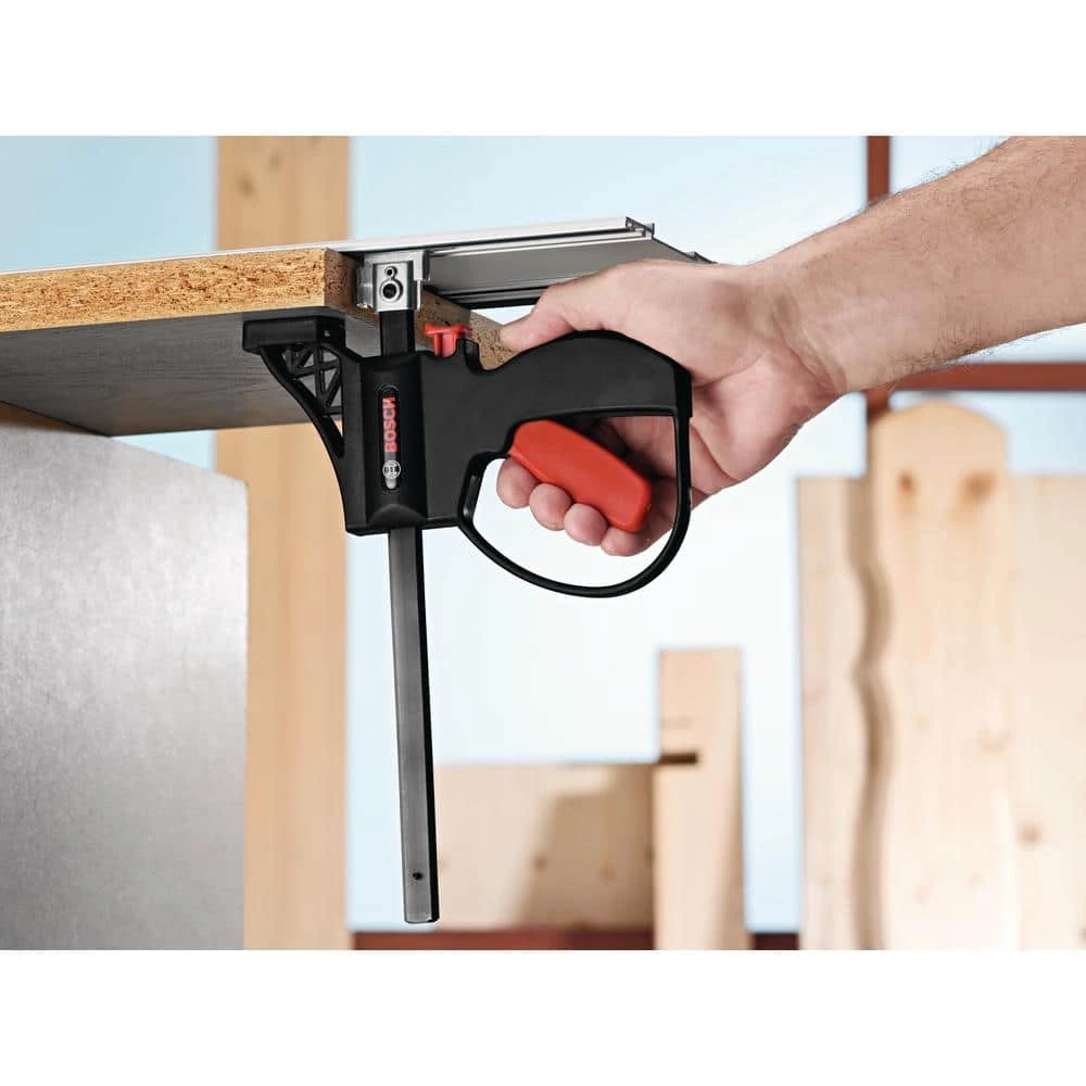 - Quick clamp design locks into Bosch track-saw tracks to secure the tracks to the workpiece with a squeeze of a trigger