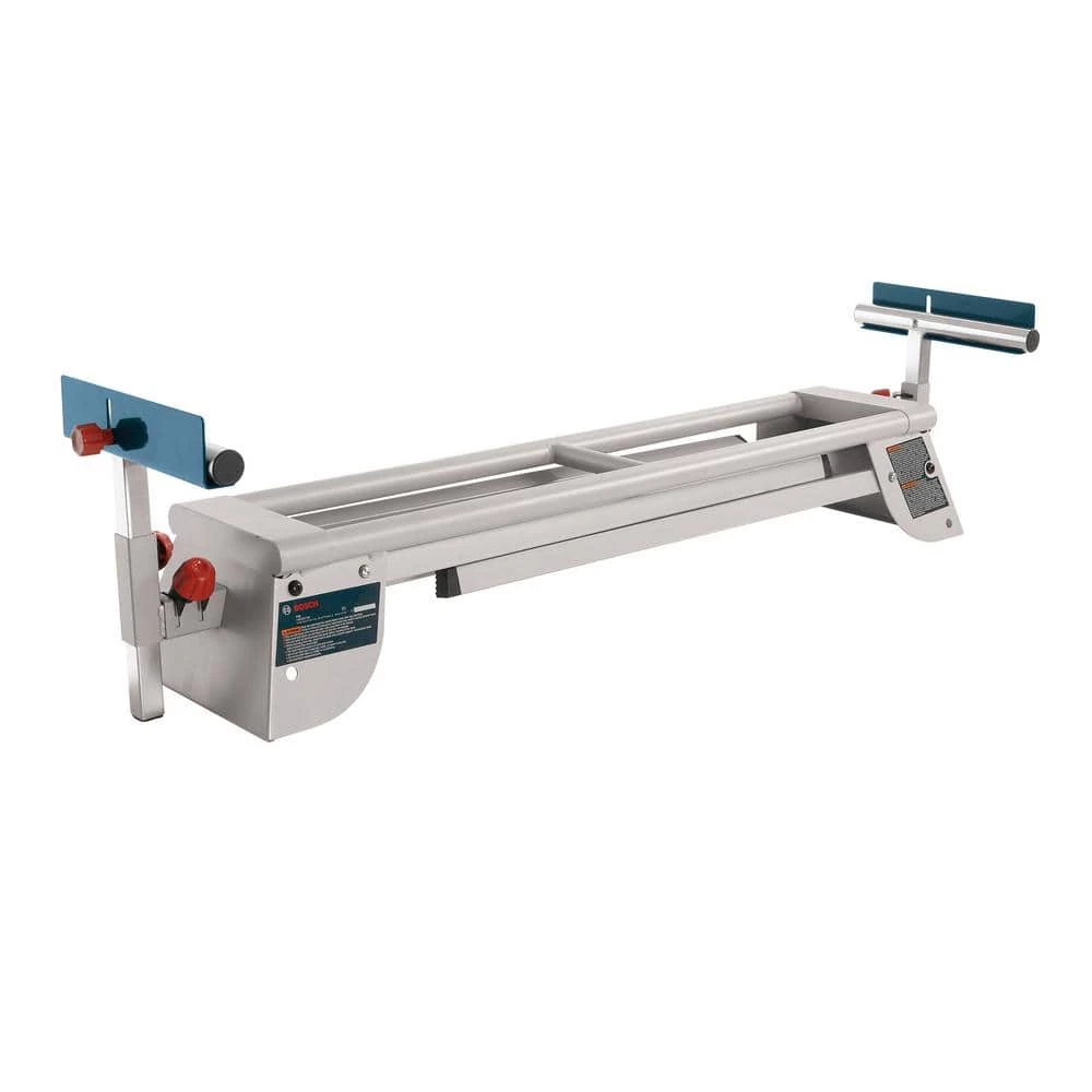 - Adjustable rounded material supports – extend out to a total of 8-1/2 ft. to support material up to 16-1/2 ft. W and retract for storage, heights adjust to accommodate various sized saws