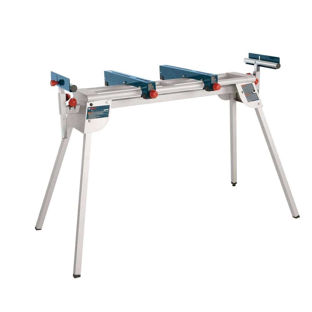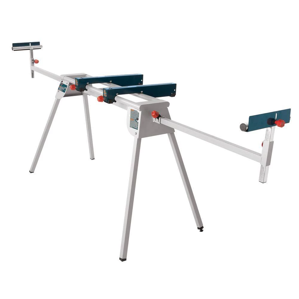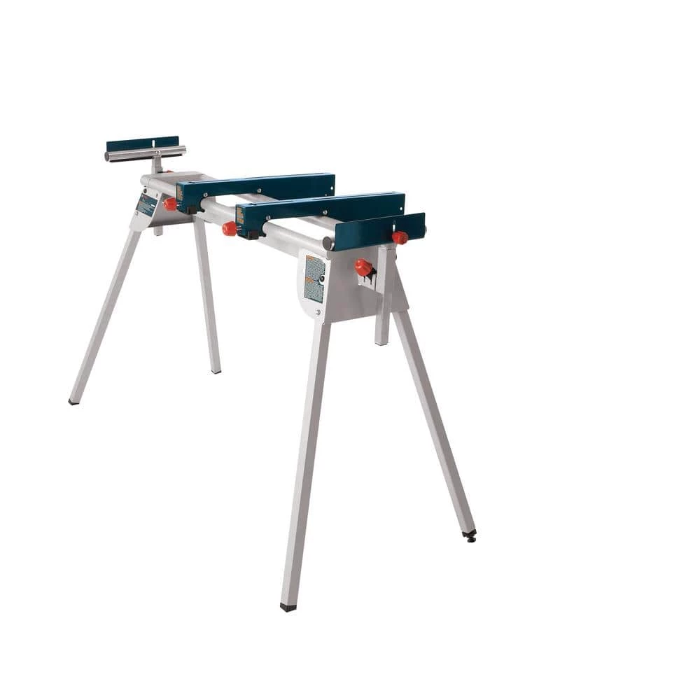 The Bosch-exclusive Axial-Glide offers wider cross-cuts, enhanced alignment and smooth glide for the life of the tool. The Bosch miter saw’s 15 Amp motor delivers no-load speeds of 3,800 RPM for quick, accurate cuts in many materials. For added convenience and versatility, the saw is compatible with a variety of 12 in. blades and it has a clear lower guard to provide unobstructed cut-line visibility. The GCM12SD provides easy adjustments with upfront bevel and miter controls and detents at common angles. The saw’s all-metal bevel lock lever and range selector are located up front to make bevel adjustments easy. The Bosch T1B Folding-Leg Miter Saw Stand features Universal Quick-Action Tool Mounts, to fit most miter saws on the market. This includes fitting Bosch 12 in., 10 in. and 8-1/2 in. single- and dual-bevel miter saws, as well as many competitor miter saws. Once attached to the saw mounts, users can attach and remove the miter saw from the stand without tools. The stand has smooth end rollers that are adjustable in height to match the height of the user’s miter saw. It features integrated repetitive stops. The dual sliding rails extend out to a total of 8-1/2 ft. to support material up to 16-1/2 ft. W.