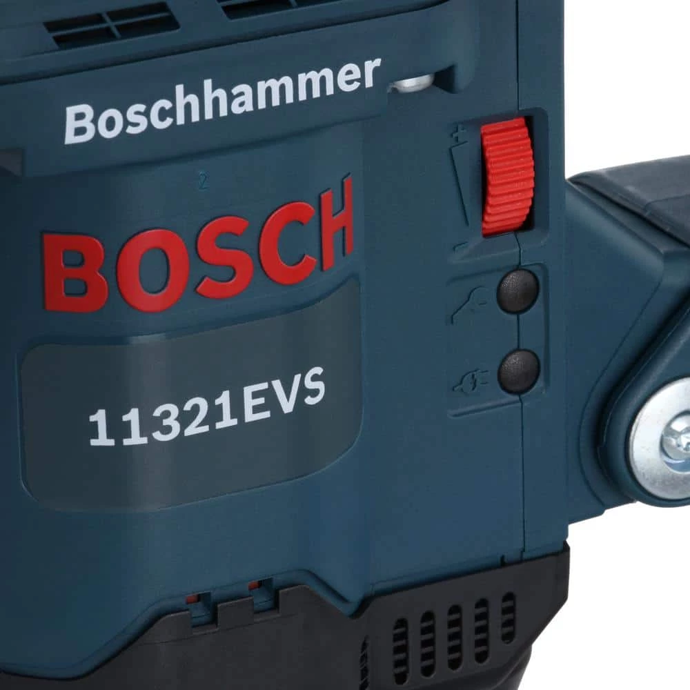 The Bosch 11321EVS SDS-max Demolition Hammer is a 13.0 Amp tool that gets the job done, delivering 6.1 Ft.-Lbs. of impact energy and a max of 2,900 BPM. Yet it weighs only 13.7 Lbs. for outstanding power-to-weight performance, and it has Vibration Control for all-day comfort. This hammer provides Constant Response circuitry for constant power under load, as well as smooth starts and overload protection. Vario-Lock positioning permits rotating and locking the chisel with precision, while the Auto-Max variable-speed dial permits the operator to match power to application – from 1,300 BPM to 2,900 BPM. The SDS-max chuck system provides tool-free bit changes, while the Service Minderlight indicates that maintenance is needed. And the demo hammer has a 360° rotating auxiliary handle and a padded rear handle for extra operator comfort.