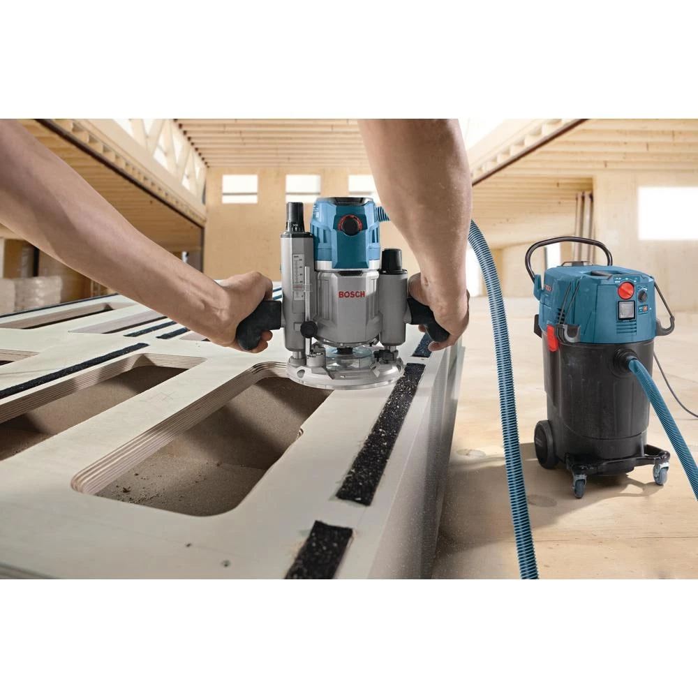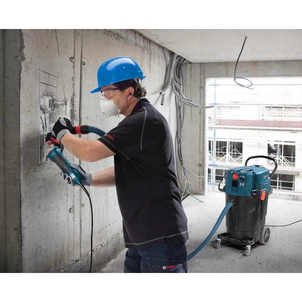 The Bosch VAC140AH 14-Gallon Dust Extractor with Auto Filter Clean and HEPA Filter provides a complete package that is designed to help users move toward compliance with the OSHA silica dust regulation. The dust extractor delivers a maximum 150-cubic-feet-of-air-per-minute rate (CFM), with a sustainable 97 in. static water lift (maximum). The automatic on-board filter-cleaning system activates every 15 seconds to help maintain maximum suction power. The included HEPA filter captures 99.97% of particles at 0.3 microns and larger. The included fleece filter bag helps to protect the filter and provides the optimal containment of dry dust and debris. The dust extractor also has power tool activation that allows the tool to activate the vac and a Power Broker dial to match the suction force to application.