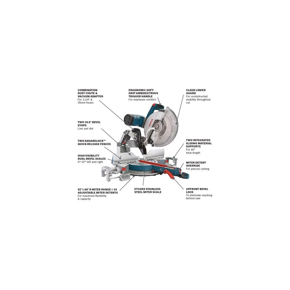 - Includes: (1) GCM12SD 12 In. Dual-Bevel Glide Miter Saw, (1) Premium 12 In. 60-Tooth Carbide-Tipped Blade, (1) Wrench, (1) Toolless Vertical Work Clamp, (1) Dust Bag/Assembly, (1) Vacuum Adapter Elbow
