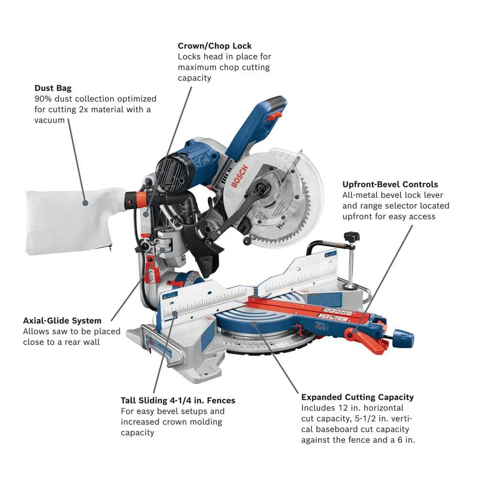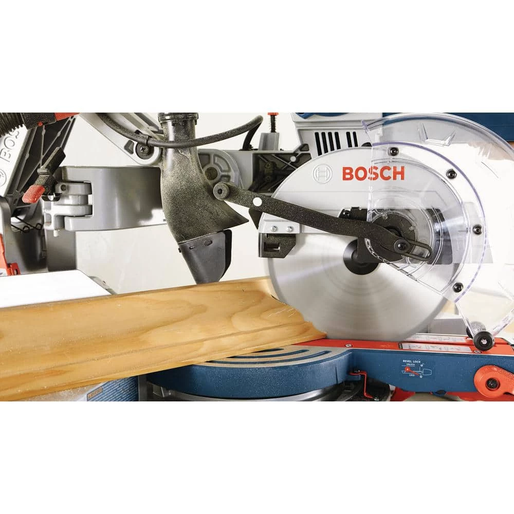 Bosch CM10GD 10 In. Dual-Bevel Glide miter saw delivers accuracy and cutting control at all angles, as well as durable precision throughout the life of the tool. The innovative Axial-Glide System provides wider cross-cuts, enhanced alignment and smoother glide, and the compact design takes up to 10 In. less front-to-back workspace than a slide miter saw. With a 15 Amp motor providing 4,800 no-load RPM, there is plenty of power. Adjustable miter and bevel detents enable users to make precise common miter and bevel cuts, and the override allows for easy angle adjustment. The bevel lock lever and range selector are located safely upfront so users don’t have to reach around behind the saw to make a bevel adjustment.