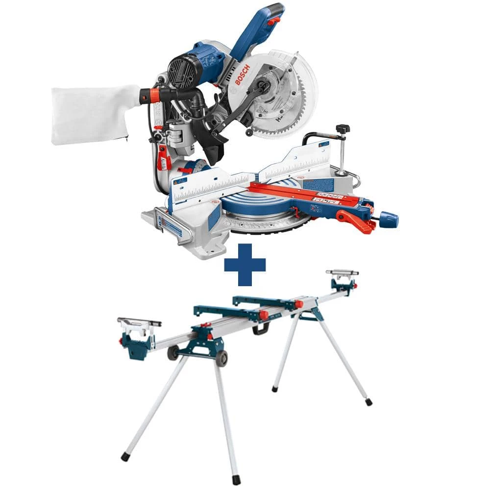 Bosch CM10GD 10 In. Dual-Bevel Glide miter saw delivers accuracy and cutting control at all angles, as well as durable precision throughout the life of the tool. The innovative Axial-Glide System provides wider cross-cuts, enhanced alignment and smoother glide, and the compact design takes up to 10 In. less front-to-back workspace than a slide miter saw. With a 15 Amp motor providing 4,800 no-load RPM, there is plenty of power. Adjustable miter and bevel detents enable users to make precise common miter and bevel cuts, and the override allows for easy angle adjustment. The bevel lock lever and range selector are located safely upfront so users don’t have to reach around behind the saw to make a bevel adjustment. The New Bosch GTA3800 features a jobsite-tough design with integrated wheels eliminating heavy lifting and giving the professional the ability to roll the saw anywhere. Rapid release universal tool mounts adapt to most competitors’ saws. The quick-release lock helps attach and detach the saw to/from stand with ease.