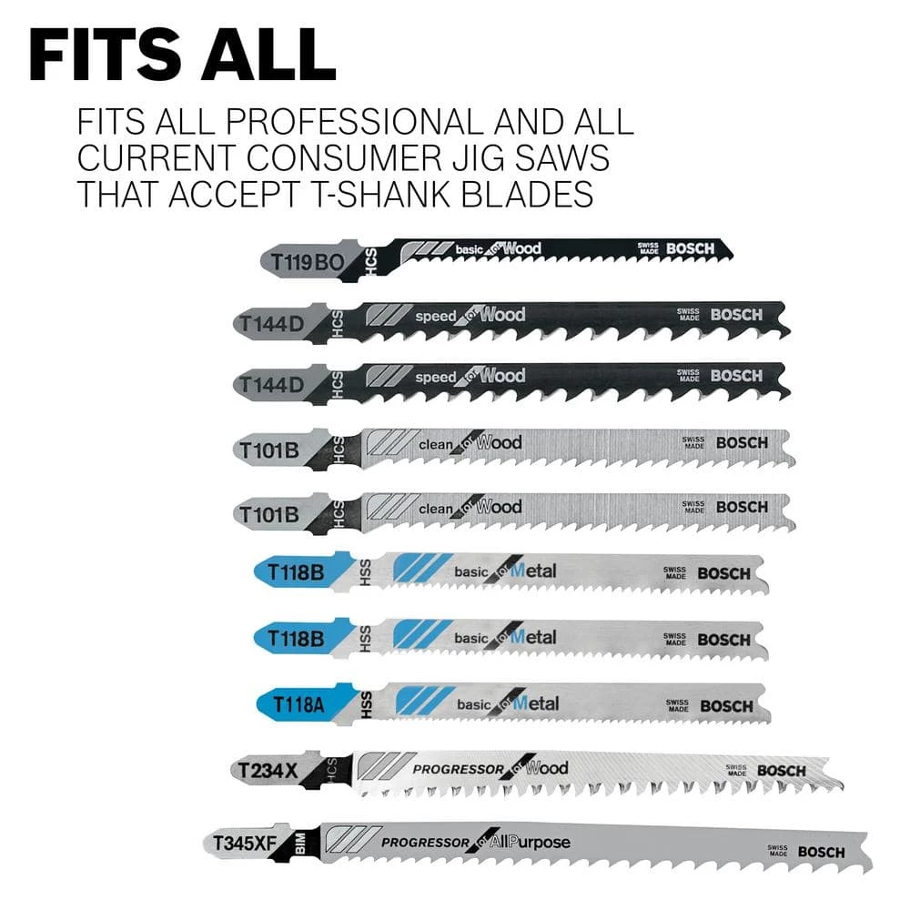 1 of the most popular Bosch wood cutting blades for all-around use. Produces clean, fast cuts in wood and wood byproducts. Efficient and economical for professional or DIY users. T-shank design for maximum grip and stability which fits 90% of all current jigsaw makes and models. Bosch 4 in. 10 TPI Wood-Cutting Jig saw Blades (5-Pack) are made of high-carbon steel. Bosch is the world-wide market leader for jig saw blades.