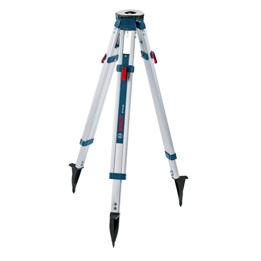 Bosch BT170 Heavy Duty Quick Clamp Aluminum Tripod This Bosch Heavy-Duty Aluminum Tripod is stronger and more rigid than comparable tripods. Features a lightweight yet heavy-gauge aluminum design with electrostatic powder-painted casting for a durable and long-lasting finish. The double banded legs provide stability. Positive locking quick clamp holds level in place. Perfect for use in the field with optical or laser levels. Features: 5/8-11 thread stud, flat head tripod Hinges attach with screws, not rivets Extends to a maximum height of 65 in. Electrostatic powder-painted castings for a durable and long-lasting finish Positive locking quick clamps Universal with string hook for plumb bob Max. height extended: 65 in. Closed height: 42 in.One Year Warranty.