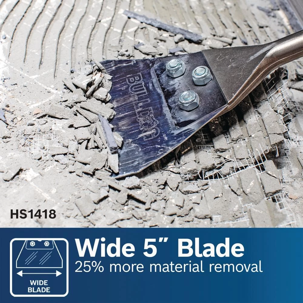 The Bosch HS1418 SDS-plus Bulldog Floor Scraper features a durable steel blade, which provides long life in mortar and tile removal. It has stable blade attachment with secure bolt-and-nut fasteners for strong blade attachment and resistance to vibrating loose. The wide 5 in. blade delivers 25% more material removal, while the 11 in. overall length (with a longer shank) allows the user to do more upright scraping for greater ergonomics. It can be used for tile removal, mortar removal, and laminate floor and laminate glue removal. The blade is replaceable, with the optional HS1418RK kit that includes a replacement blade and nuts, bolts and washers.