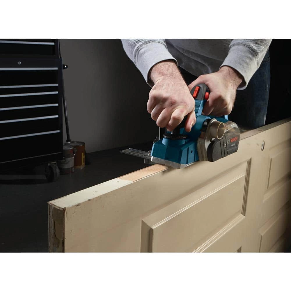 Industry-first planer lock-off/lock-on button helps prevent accidental start-up and provides for extended operation. Dual-mount fence provides non-flexing guidance; prevents marring of door or workpiece face. Spring-loaded, built-in stand elevates tool to protect blade(s) and save money. Powerful 6.5 Amp motor with 16,500 RPM speed for fast stock removal. Dust ports are located on both sides of the tool to accommodate large shavings bag. Tough and durable, the Bosch Woodrazor 3-1/4 in. Planer Blades (2-Pack) provide an excellent finish to your wood cuts. Made with micro grain tungsten carbine, the blades are double-edged and reversible.