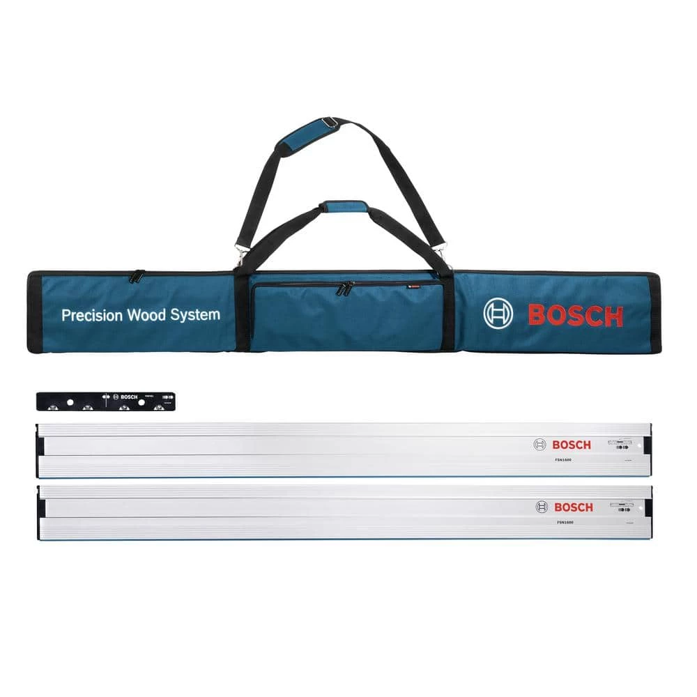 The Bosch FSN1600X2B 63 In. Tracks and Connector Kit is a convenient timesaver allowing pros who want to bring the Bosch Track Saw (sold separately) and track-guidance system to the jobsite. It features two FSN1600 tracks, which are 63 In. (1600mm) long; an FSNVEL connector; and a FSNBAG track bag. The FSN1600 track is precisely straight and manufactured with exacting tolerances. It includes an anti-splinter guard and two rubberized traction strips, each custom molded to securely interlock with a slot in the track. The FSNVEL is a sturdy connecting piece to quickly connect tracks, and its self-aligning, helping to ensure precise work. The durable bag allows practical transport of the tracks.