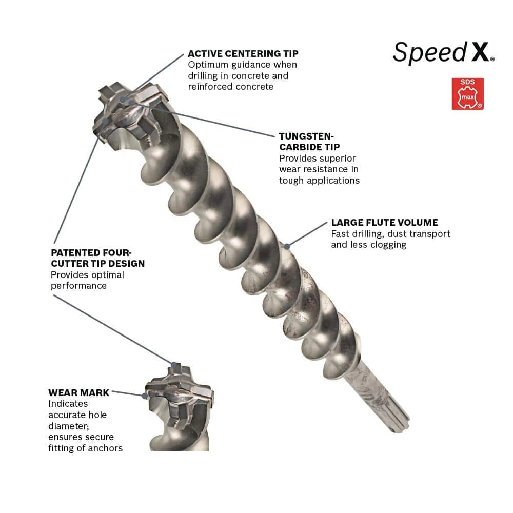 Bosch carbide rotary hammer bits feature tips that stay sharper longer and deliver more holes within specification than competitive bits. Manufactured to ANSI specification B212.14. SDS-MAX rotary hammer bits fit Bosch SDS-MAX hammers and competitive SDS-MAX drive hammers and Hilti hammers using TE-Y and TE-FY shanks. Unrivaled power from solid carbide head with robust S-cutter design for added speed and life.