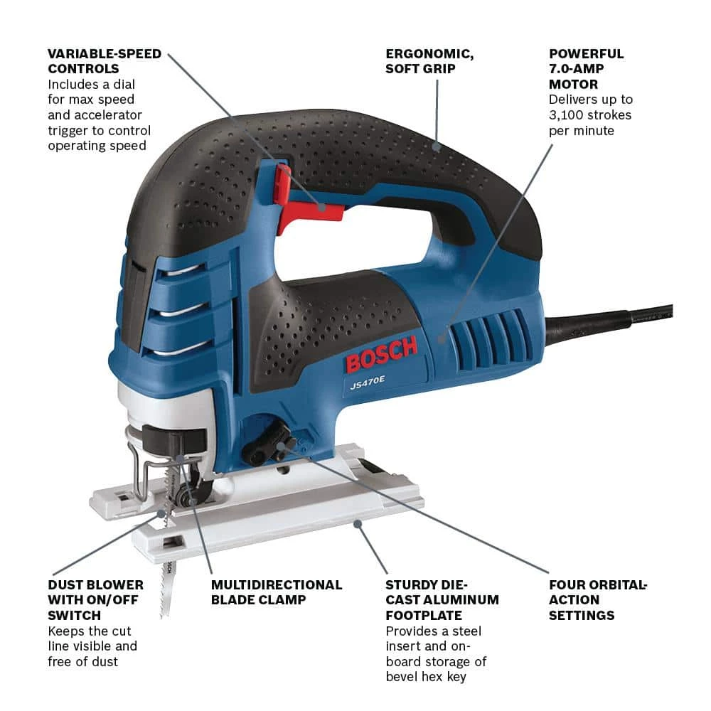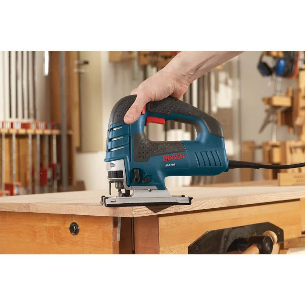 The Bosch JS470E Top-Handle Jig Saw provides unsurpassed cut precision. Finish carpenters and kitchen and bath installers will appreciate the best-in-class 7.0 Amp motor and variable-speed control, making this saw an excellent choice for curve-cutting. A dial on the back of the tool controls the maximum speed and the accelerator trigger controls the operating speed. Built with an aluminum gearbox and an insulated cover, this jig saw comes with a low-vibration plunging design and Constant Response circuitry for consistent speed under load. It has a large die-cast aluminum footplate. The JS470E’s multidirectional blade clamp delivers superior grip of T-shank blades (but it does not accept U-shank blades). The blade-ejection lever that eliminates need to touch hot blades. It has a dust blower for max cut-line visibility.
