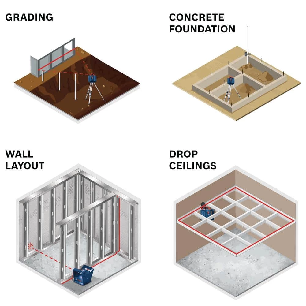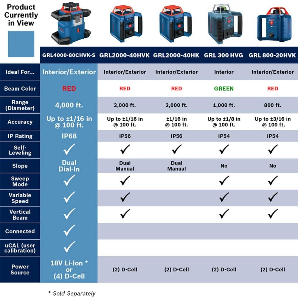 - Includes: (1) GRL800-20hv self-leveling rotary laser, (1) LR 30 laser receiver with bracket, (1) BT152 aluminum tripod, (1) GR 8 C 8 ft. grade rod, (1) WM 24 wall mount, (1) red laser glasses, (1) red target card, (2) D batteries, (1) 9-Volt battery, (1) carrying case