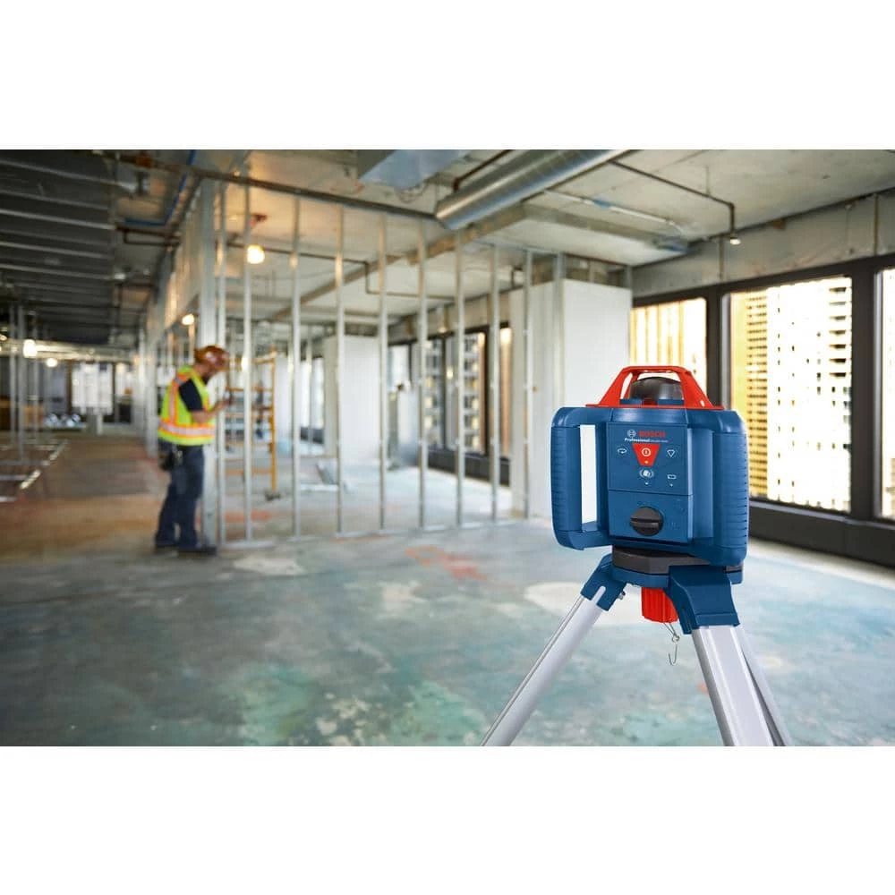 The Bosch GRL800-20HVK Self-Leveling Rotary Laser Kit delivers all-in-one package for precise outdoor and indoor leveling. It features a horizontal/vertical self-leveling laser, suitable for leveling, aligning and squaring applications. The rotary laser provides users with variable speed selection and manual scan angles for maximum visibility at different lighting conditions. It delivers accuracy of up to ±3/16 In. at 100 Ft, and a range of up to 800 Ft. with laser receiver. The electronic self-leveling system has a disturbance monitor, which indicates to the user if tool position changes, ensuring consistent leveling accuracy on the jobsite. Easy to use, the laser has a metal cage and an IP54 rating. This leveling solution includes a laser receiver, tripod, sturdy grade rod, wall mount, laser glasses, target card and hard carrying case.