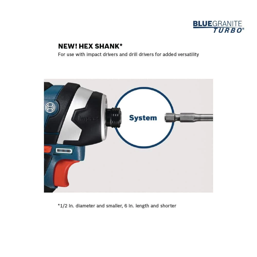 Bosch BlueGranite Turbo bits begin with the aggressive holds achieved on the PowerGrip shank. Flat tabs that extend from the shank are designed to catch between the jaws of power tool chuck systems. That means the bit is easy to chuck in the tool and the bit won’t slip. The tip of the BlueGranite Turbo bit is Bosch carbide, diamond ground for precise starts to avoid scratching and skating in tile and hard stone.