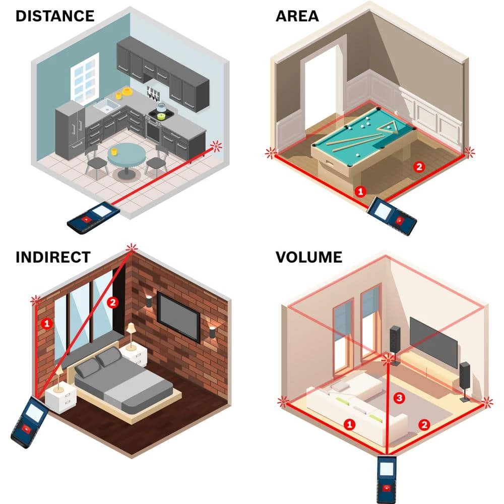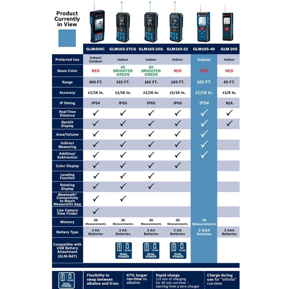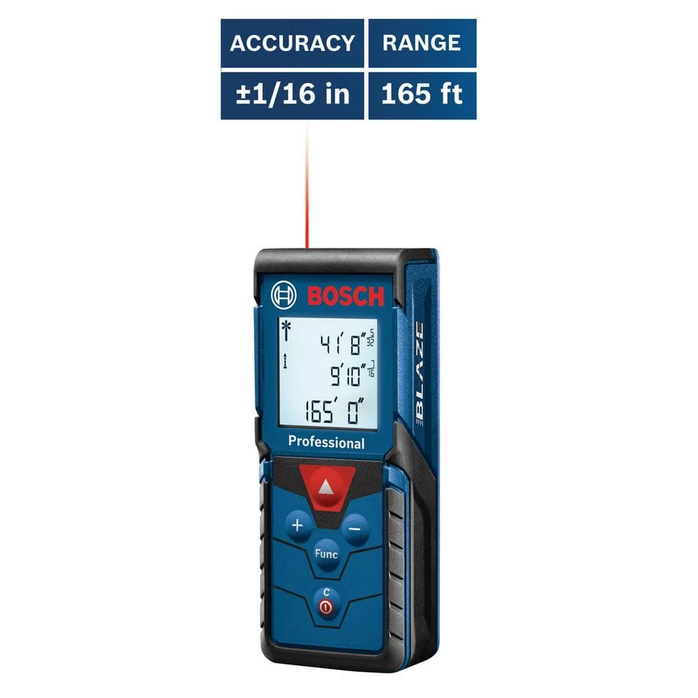 Measure with precision and speed with the Bosch BLAZE Pro GLM165-40 165 ft. Laser Measure. This fully featured tool provides default real-time distance, area, volume and indirect measuring functions. An easy-to-read backlit display lets you get readings day or night. Laser precision technology allows this pocket-sized tool to take instant and reliable measurements up to 165 ft., so you can size up the job in seconds. It is accurate up to 1/16 in.