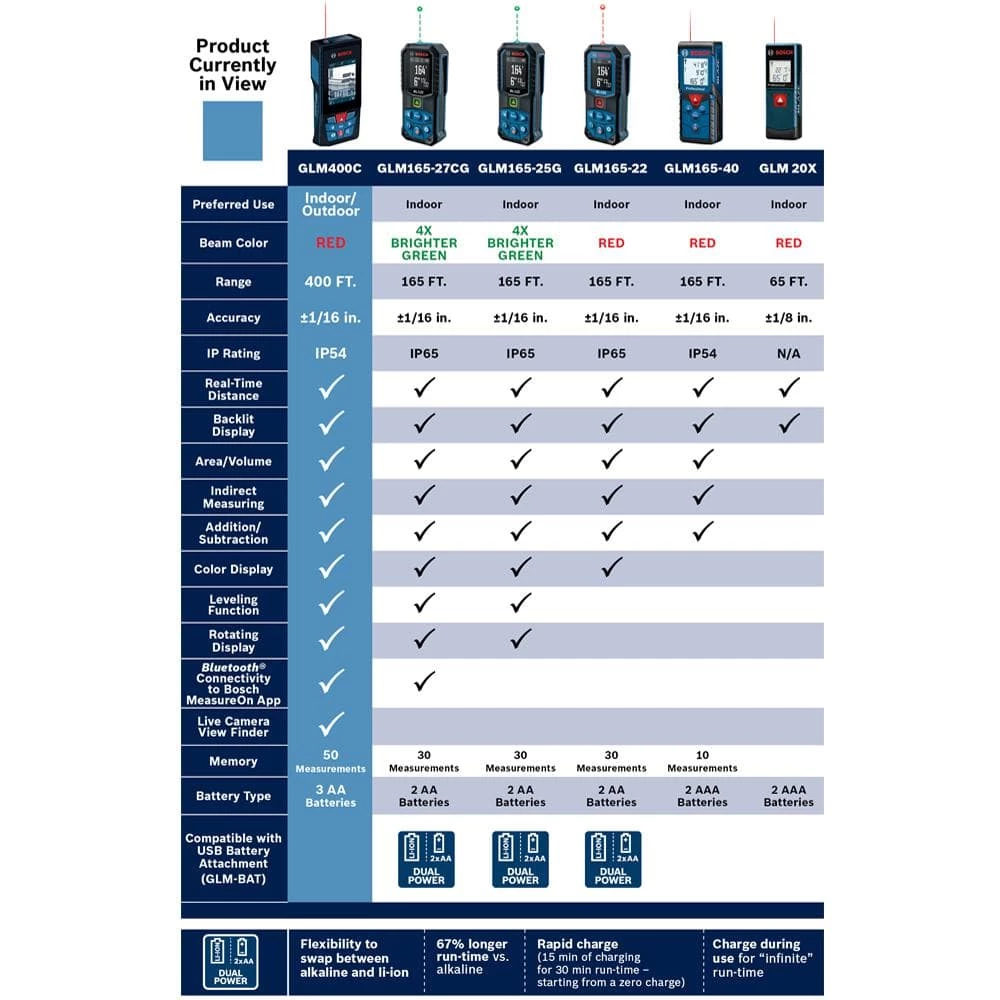 - BLAZE outdoor technology – outdoor laser measuring device that pairs accurate, long-distance (up to 400 ft.) measuring and digital viewfinder with next-gen, connected convenience to simplify project management through the free Bosch MeasureOn app