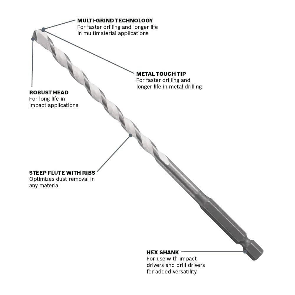 Tough tungsten carbide makes bit suitable for multi-material applications. Sharp diamond-ground edges deliver high drilling speed, even in hard materials. Optimized drilling for good dust clearance in multiple materials.