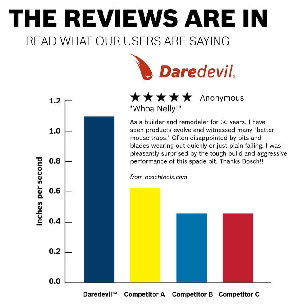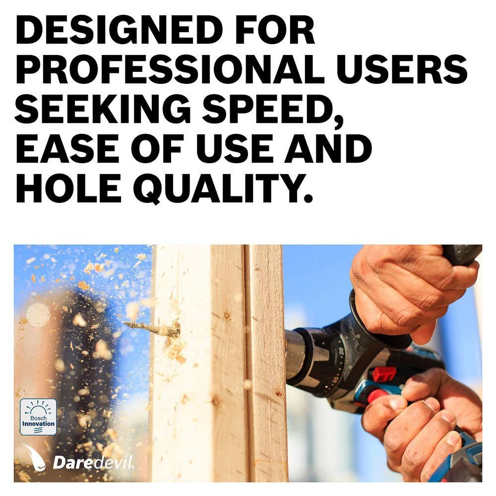 The Bosch Daredevil spade bits deliver speed, ease of use and hole quality. The Daredevil paddle generates 10 times faster drilling vs. standard spade bits. The bit has a hex shank with power groove for better bit grip, and a full-cone threaded tip for fast and effortless drilling.
