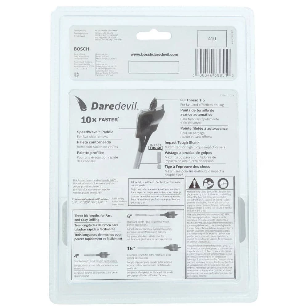 The Bosch Daredevil spade bits deliver speed, ease of use and hole quality. The Daredevil paddle generates 10 times faster drilling vs. standard spade bits. The bit has a hex shank with power groove for better bit grip, and a full-cone threaded tip for fast and effortless drilling.