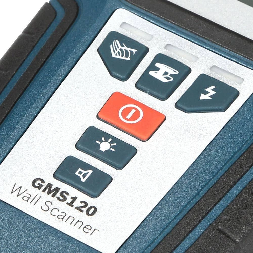 The New Bosch GMS120 Wall Scanner features Multi-Mode Detection-For wood studs, metal objects (rebar, studs and steel/copper pipes) and live wiring. Illuminated Graphical LCD Display-Indicates mode, detection strength and more. Deep Metal Detection Capability-Detects steel up to 4-3/4 in. (120 mm) deep in cured concrete. Automatic Center Finder-For locating center of detected wood or metal object. 3 Selection Modes (Wood, Metal, AC Wiring) with automatic calibration for easy and precise detection. Audible Detection Signal-With On/Off button. Ergonomic Soft-Grip-For secure grip and comfort. Illuminated ring indicates detection status.