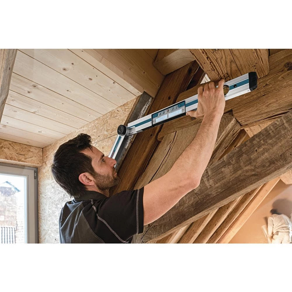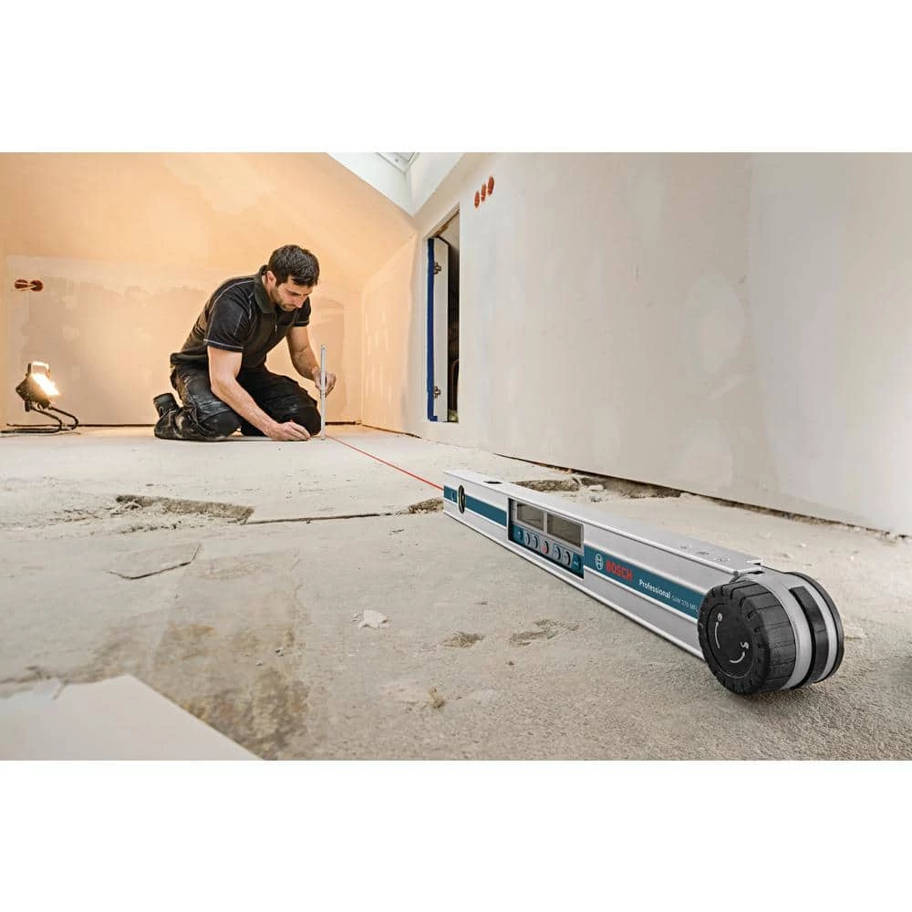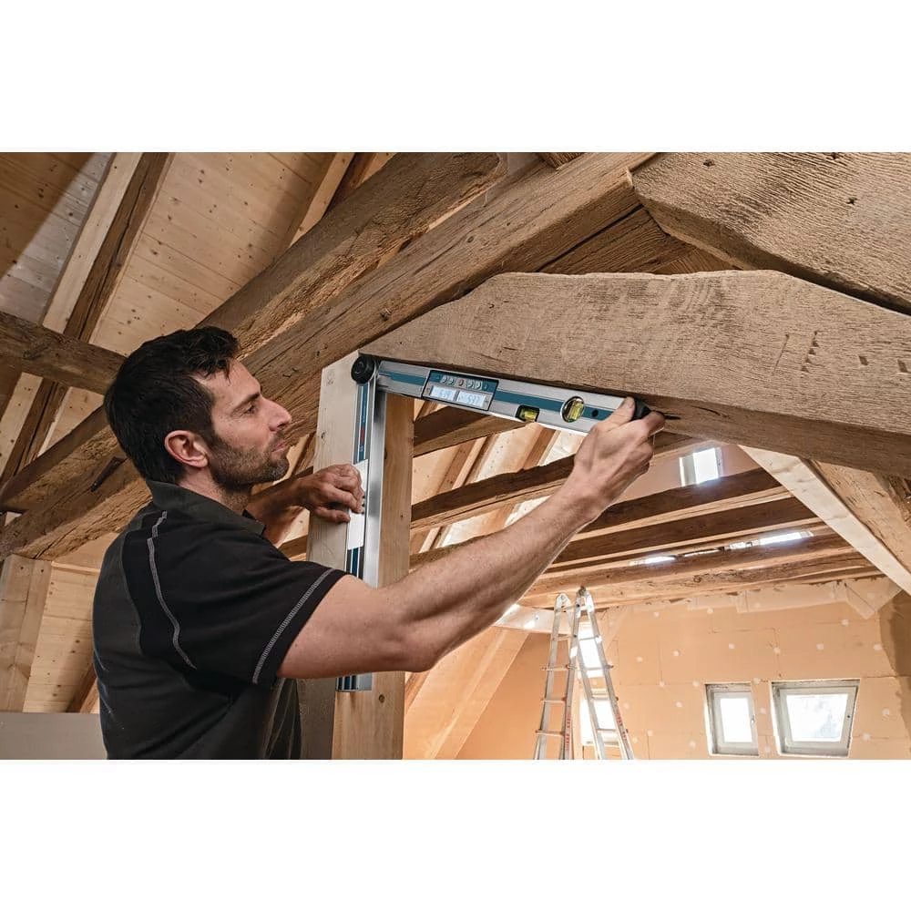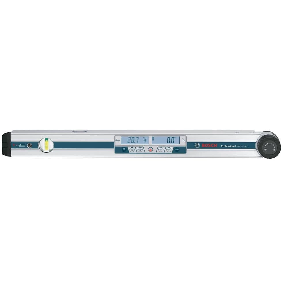 The Bosch GAM 270 MFL Digital Angle Finder and Inclinometer is 5-tools in one: a digital angle finder, an inclinometer, a miter cut calculator, a protractor and a digital level. The angle finder provides accurate angle targets, while the inclinometer offers precise measurements in degrees. The tool is also equipped with an integrated laser, allowing the user to transfer inclination measurements up to 100 ft. The tool has two easy-to-read illuminated, flip displays, one for the inclinometer and one for the angle finder. Users are able to easily reuse and transfer save measurements with the hold function. The cut calculator provides easy saw angle adjustments and a compound miter calculator. Users can find the miter angle using the tool’s legs, which have an angle range of 0-270°. The compound miter calculator is used to measure joint angles that are not perpendicular. The tool has clearly labeled buttons for straightforward calculations. The angle finder has robust housing with IP 54 protection.