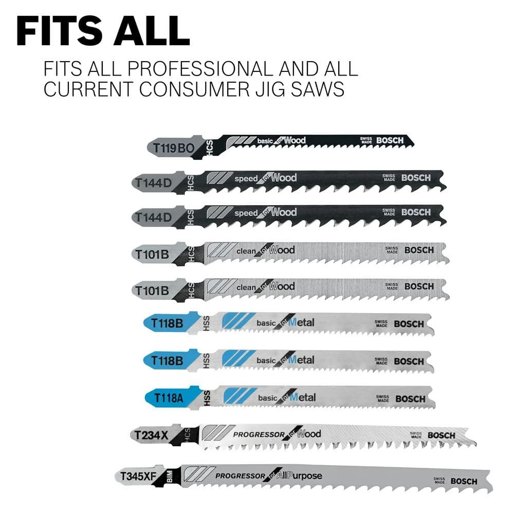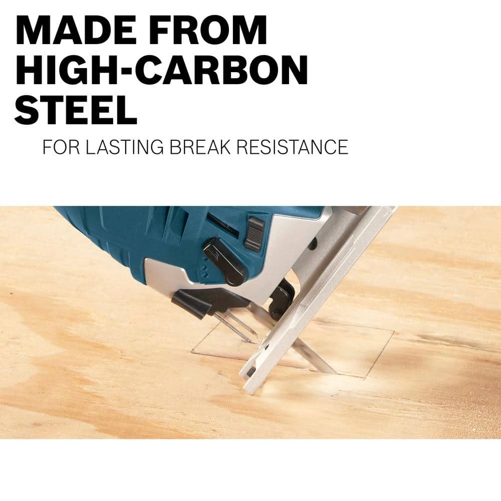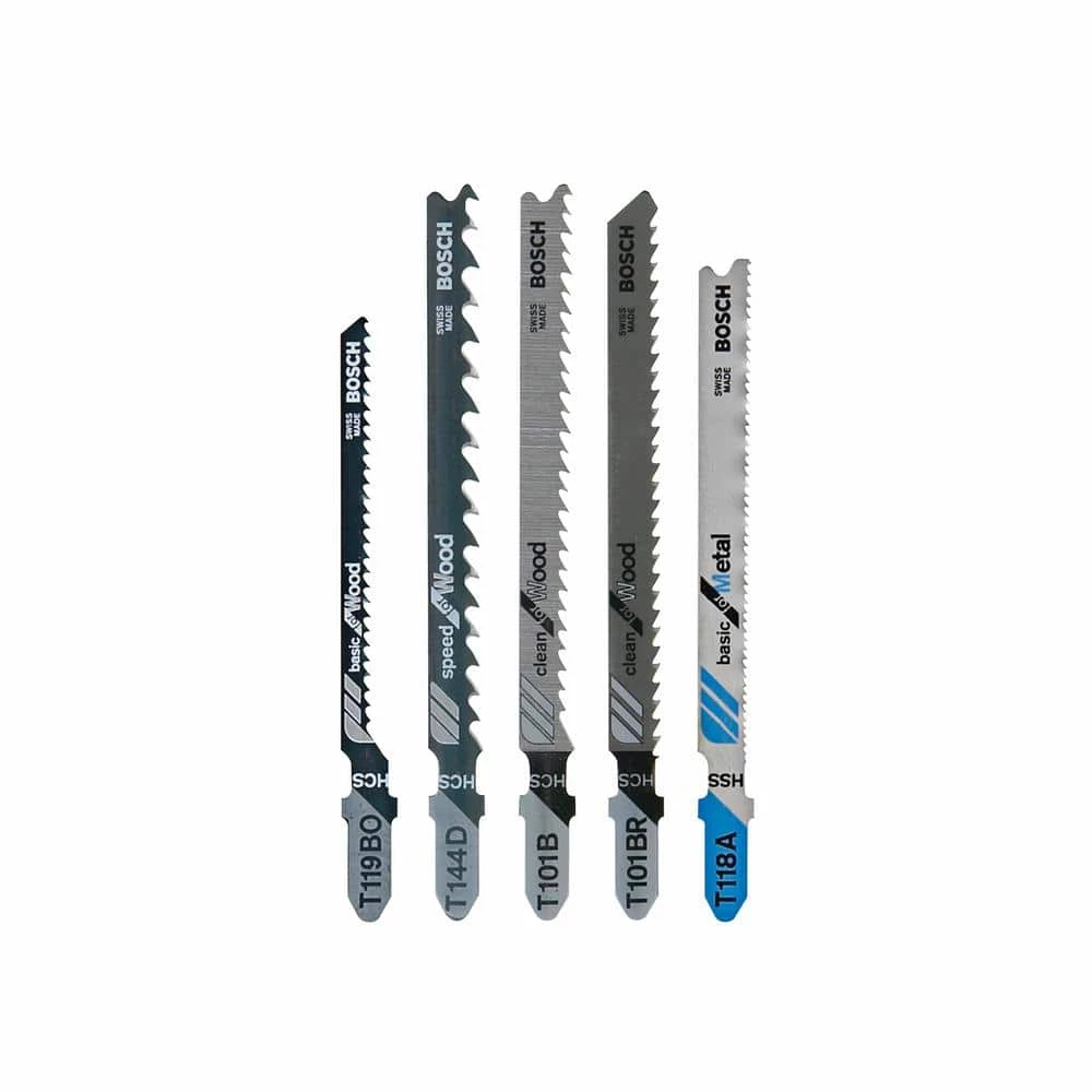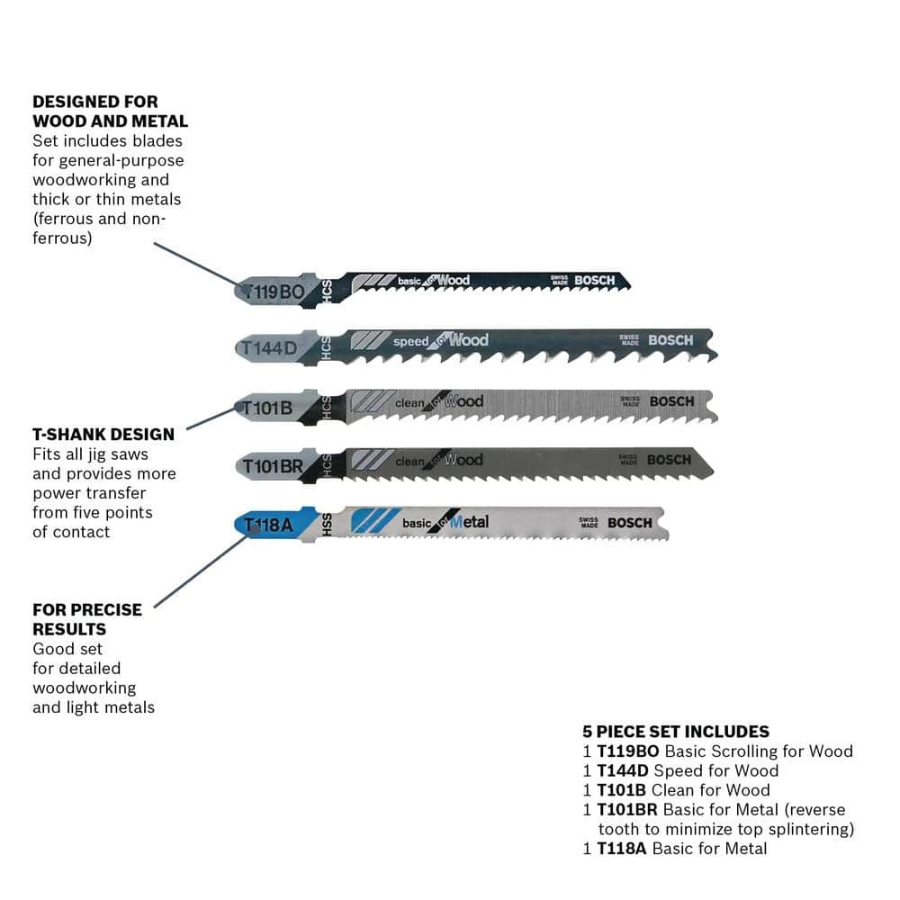 Cut metal and wood with the Bosch T-Shank Jigsaw Blades. These quality, high-carbon steel blades range in 5 TPI to 24 TPI. This 5-pack features teeth with a range of designs for a choice of cutting speeds and finishes. Use these blades for general-purpose woodworking and metals (ferrous and non-ferrous).